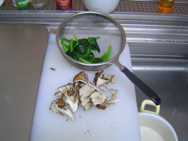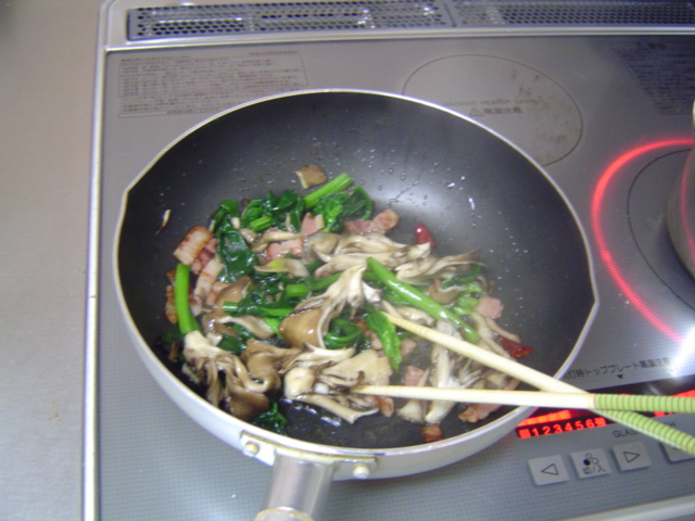 そして、ほうれん草、舞茸を炒めます。