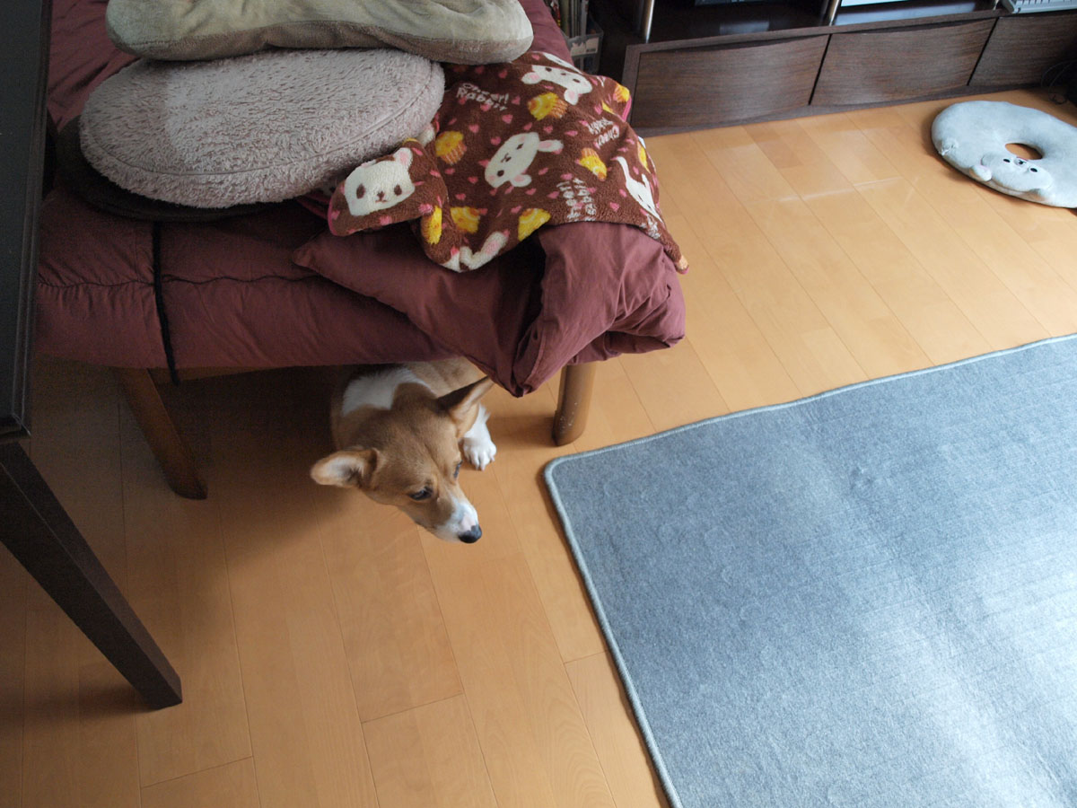 机の上の布巾を盗ったので怒られて反省中。
